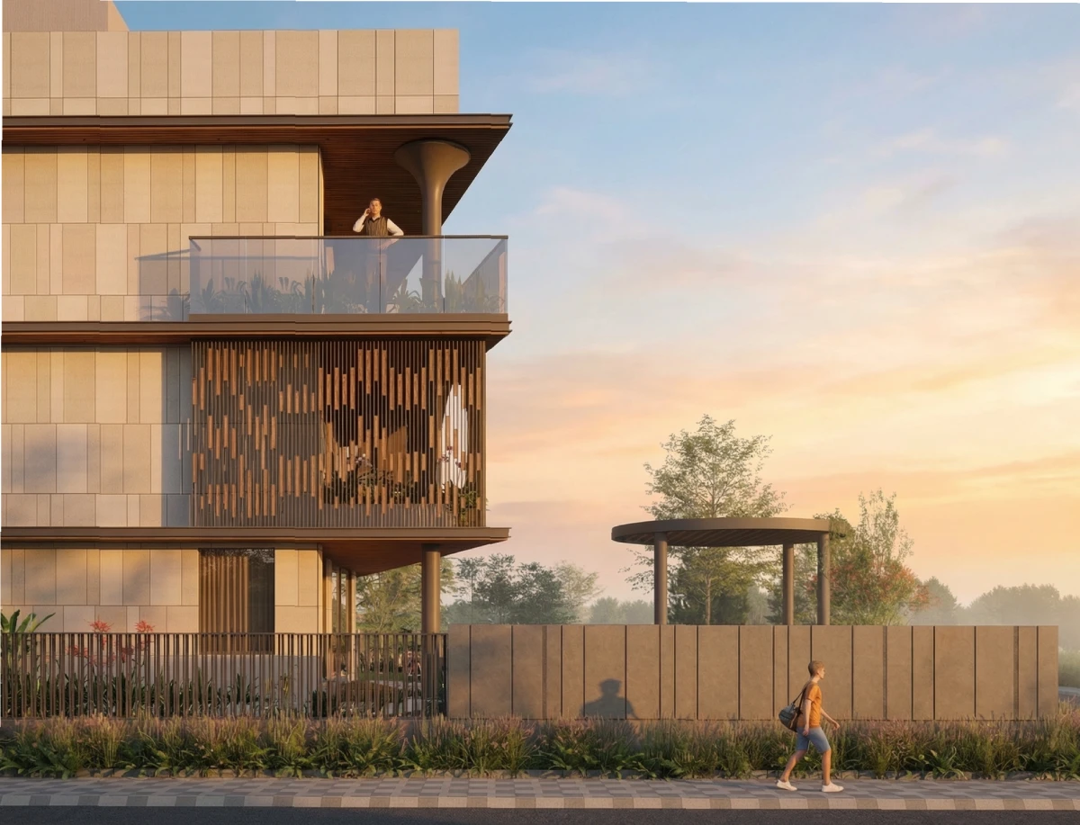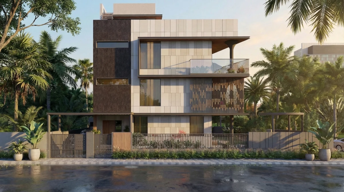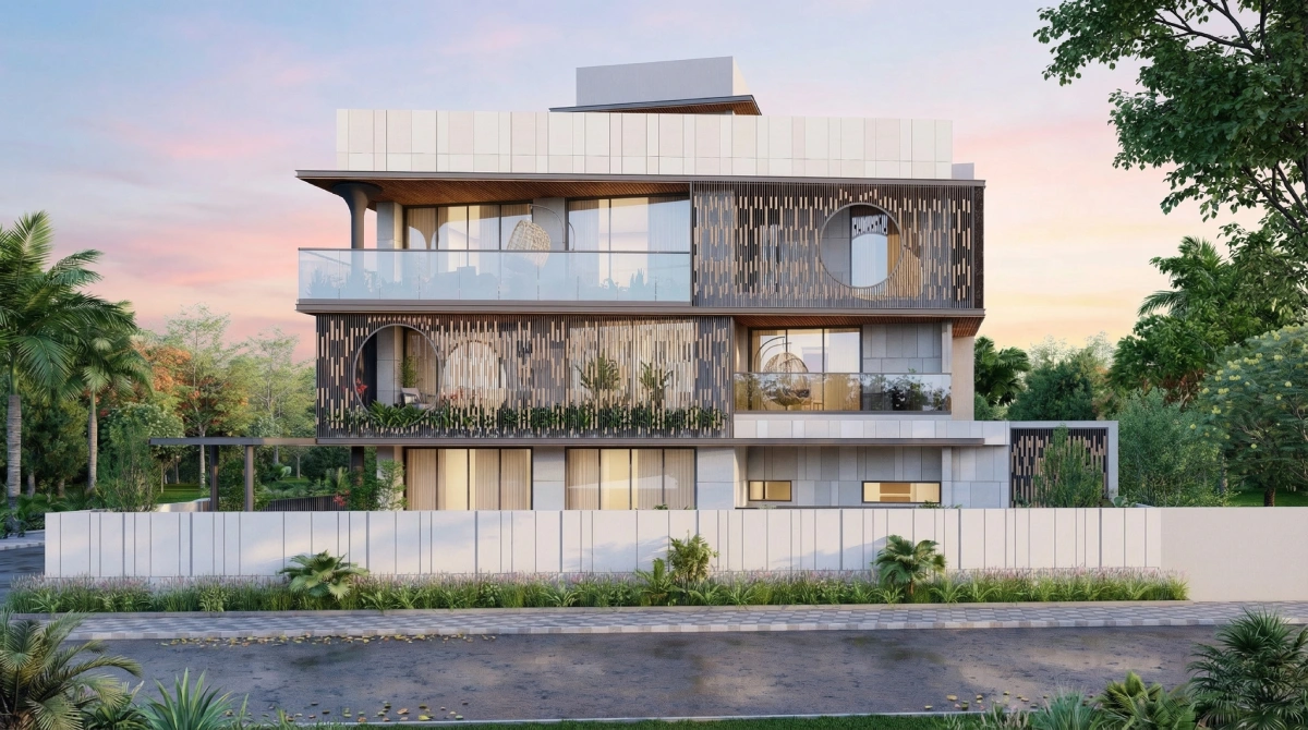 Instead of relying on symmetry, the design plays with offset masses and sculpted openings, creating a dynamic identity from every angle. The circular cut-outs and vertical louvers are not decorative they act as climatic devices, softening harsh sunlight while maintaining visual permeability.