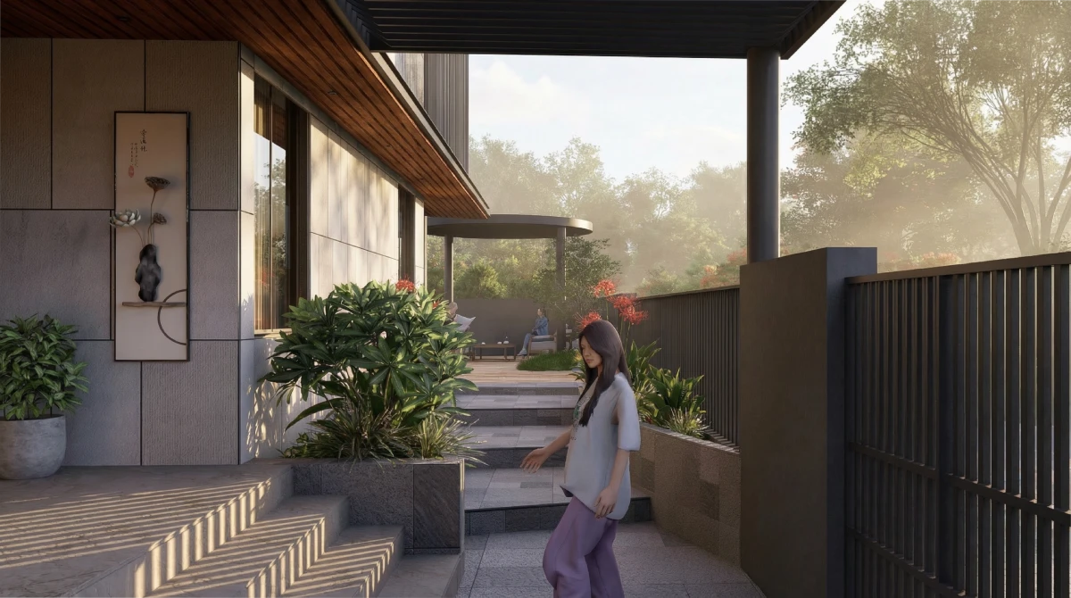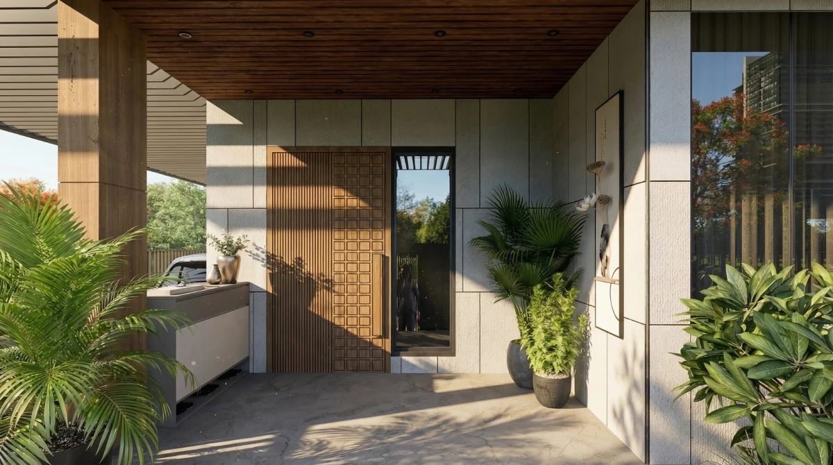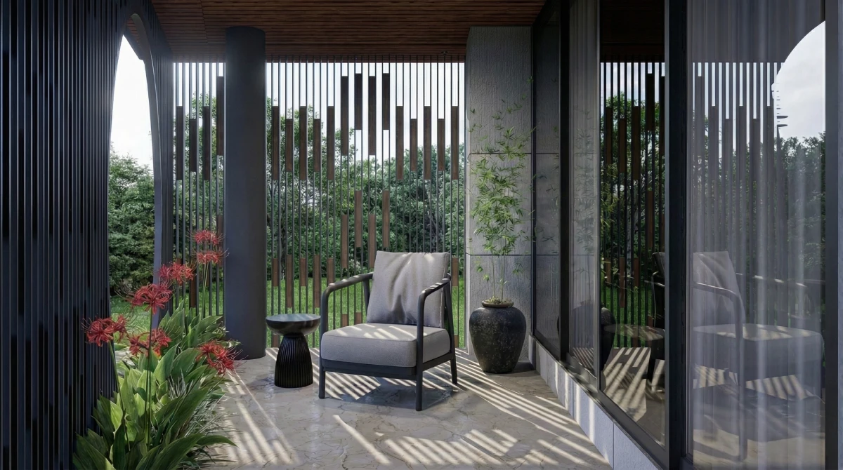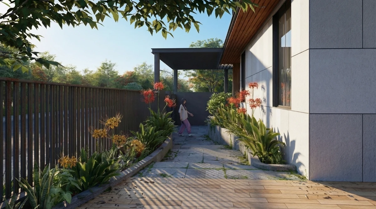 The planning of the bungalow moves beyond conventional layouts. Spaces are not boxed they flow. Semi-open edges, extended balconies, and shaded sit-outs create transitional zones between indoors and outdoors. These edges become the most lived-in parts of the home.